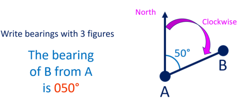 Bearings are used to describe the direction of one point relative to another. Bearings are measured clockwise from the north direction and are usually expressed in three digits. For example, \(045^\circ\) represents a bearing of \(45^\circ\) from north.